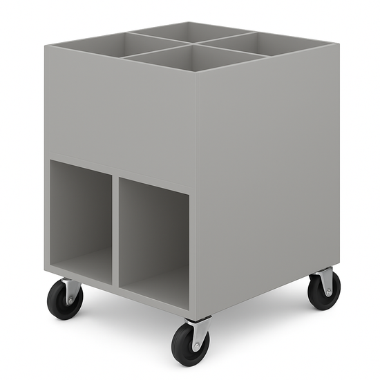 Forme carrée avec séparateurs. 4 compartiments supérieurs & 4 cases verticales inférieures.
