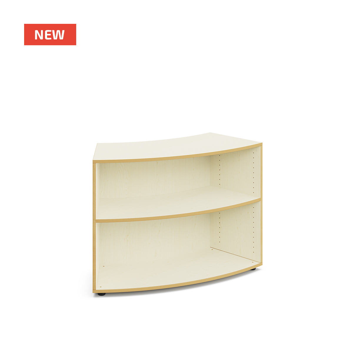 Bibliothèque scolaire ouverte et incurvée avec 2 espaces de rangement.