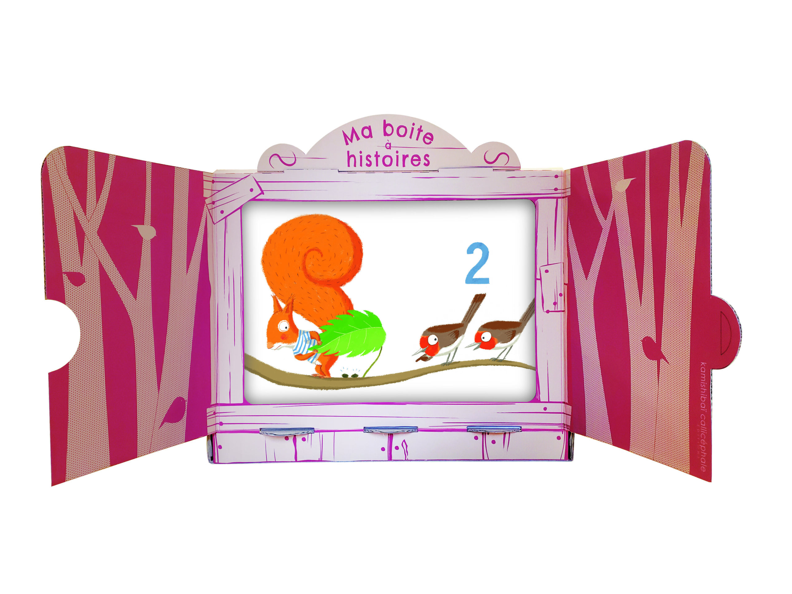 Coffret qui peut contenir jusqu’à 2 kamishibaï et comporte un théâtre en carton pour raconter les kamishibaï. Coffret destiné au format 28×38 cm.