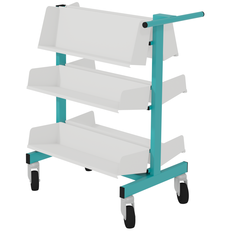 Sur 3 niveaux. Structure en tube 50×25 mm, poignée et tablettes amovibles (position latérale ou inclinée) en acier peint poudre époxy. Contact au sol sur roulettes.
