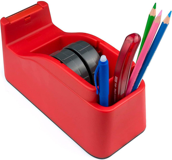 Peut contenir un grand rouleau de 50 mm ou 2 rouleaux de 25 mm de large. Base antidérapante et poids de 1,8 kg permettant de dérouler et déchirer le ruban d’une seule main. Porte-stylos intégré.