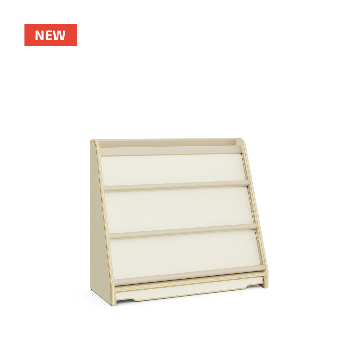 Support d’exposition de livres pour enfants en contreplaqué de hêtre. A l’arrière, des étagères supplémentaires offrent une plus grande capacité de rangement.