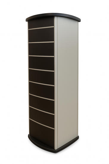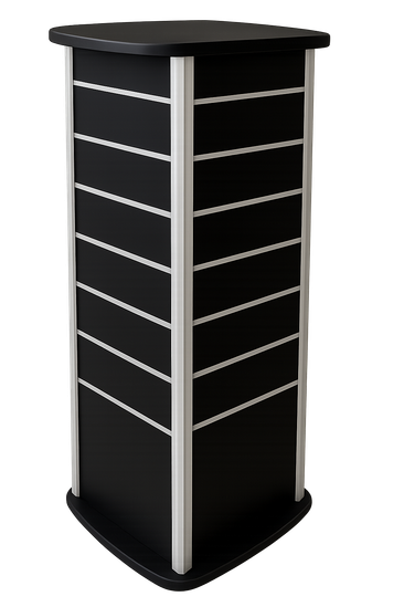 Colonne 3 faces dont 2 avec profils rainurés en aluminium et 1 face en tôle film “tableau blanc”. En mélaminé hydrofuge 19 mm.