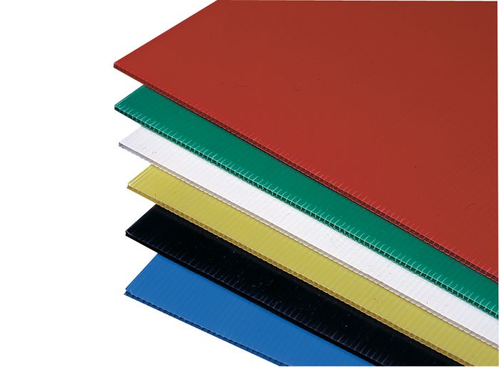 Plaques extrudées en polypropylène constituées de 2 feuilles planes reliées par des entretoises, semblables à du carton ondulé mais beaucoup plus rigide et résistant.