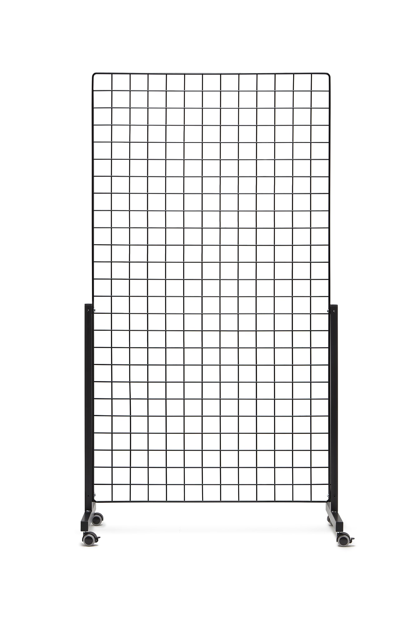 Grille d’exposition métallique peinte en époxy noir, fabriquée avec des tiges en fer de 0,5 cm. Maille de 7×7 cm.