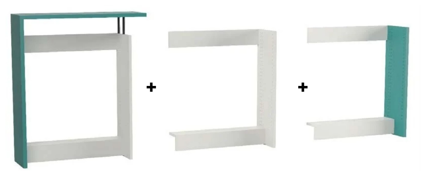 Panneau suivant et traverses ép.2 mm mélaminé chant ABS ép.2 mm. Perforation D7 mm au pas de 32 mm sur les panneaux latéraux. Tube de surélévation en acier D20 mm peint poudre époxy. Contact au sol sur vérins réglables en hauteur coloris noir.
