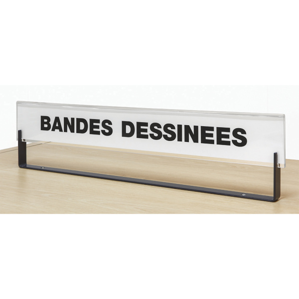 Bandeau en plexiglas avec bristol. Support en acier peint poudre époxy. Fixation par vis à bois sur la structure. Pour rayonnage fermé.