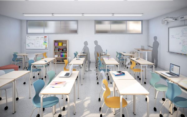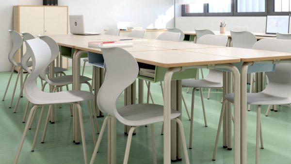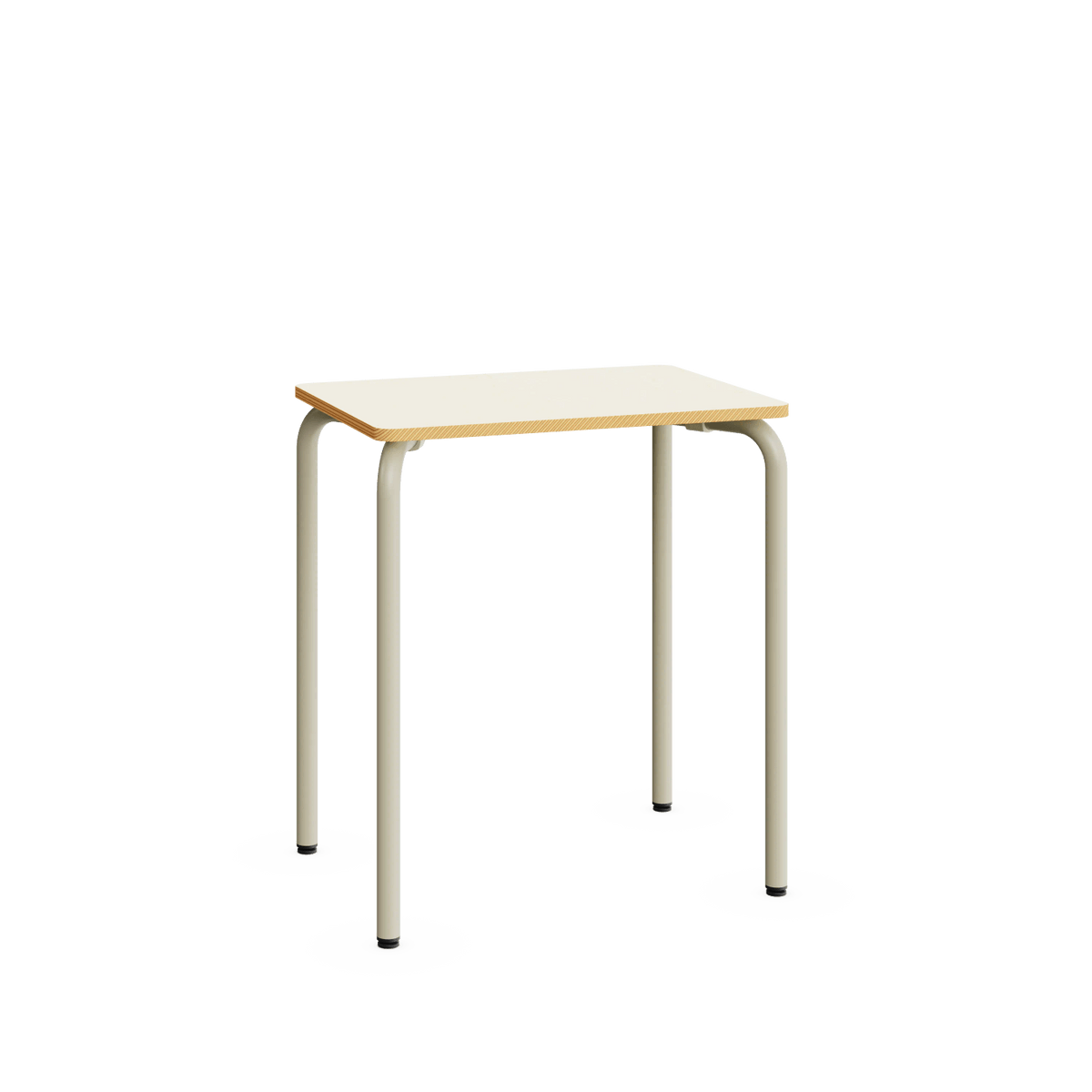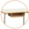 Table de forme rectangle, structure tubulaire en métal et plateau en aggloméré.