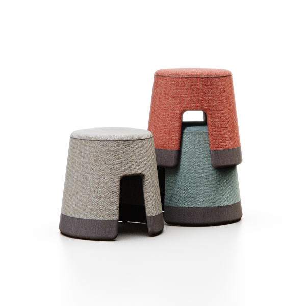 Tabouret modulaire, rembourré, combinable et empilable pour former différents espaces. Utilisation intérieure. 3 coloris.